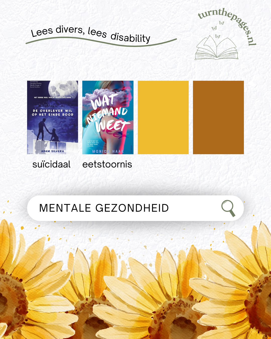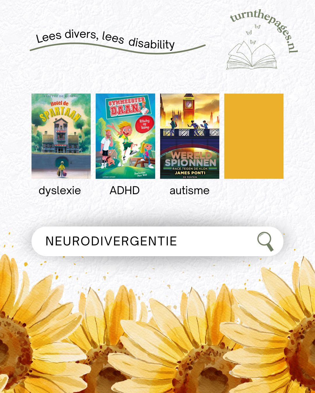 Drie keer per jaar presenteren uitgeverijen hun aanbiedingsfolder. Drie keer per jaar pluis ik alle folders uit, op zoek naar boeken met disability representatie. Alle dertien boeken hebben één of meer personages met een fysieke of mentale handicap of beperking. Speciaal voor jou heb ik ze op een rijtje gezet. Welke boeken wil jij graag lezen?